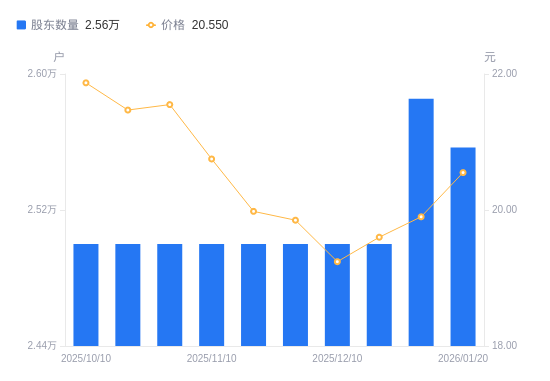 2月3日消息,数据显示,截至2026年1月30日,瑞普生物A股股东总户数为2.62万户,较上期(2026年1月20日)增加647户,增幅2.53%。公司最新A股总股本为4.65亿股,其中流通A股3.35亿股,户均持有流通A股数量为1.28万股,较上期减少323.36股,降幅2.47%;户均持流通A股市值25.45万元,较上期减少1.47万元,降幅5.46%。