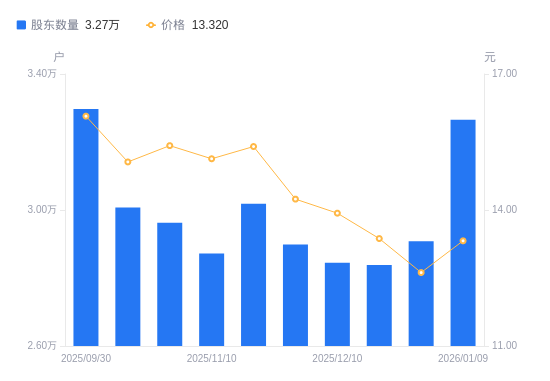 1月16日消息,数据显示,截至2026年1月9日,阳谷华泰A股股东总户数为3.27万户,较上期(2025年12月31日)增加3576户,增幅12.30%。公司最新A股总股本为4.45亿股,其中流通A股4.29亿股,户均持有流通A股数量为1.31万股,较上期减少1616.82股,降幅10.95%;户均持流通A股市值17.51万元,较上期减少1.12万元,降幅6.01%。
