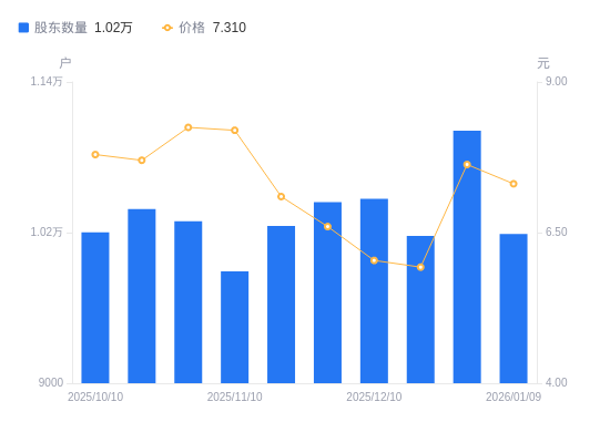 1月12日消息,数据显示,截至2026年1月9日,*ST聆达A股股东总户数为1.02万户,较上期(2025年12月31日)减少823户,降幅7.47%。公司最新A股总股本为6.66亿股,其中流通A股3.61亿股,户均持有流通A股数量为3.54万股,较上期增加2647.06股,增幅8.08%;户均持流通A股市值25.89万元,较上期增加8864.16元,增幅3.55%。
