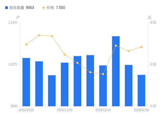 近一年(2025年2月10日至2026年1月30日),*ST聆达A股股东户数从1.14万户,减低至9903户,降幅13.22%,区间股价上涨60.33%。