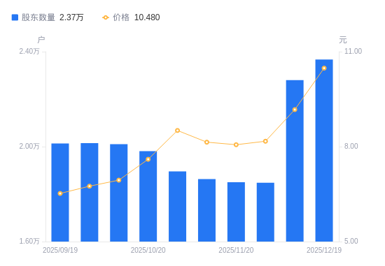 近一年(2024年12月31日至2025年12月19日),先河环保A股股东户数从2.38万户,减低至2.37万户,降幅0.37%,区间股价上涨74.38%。