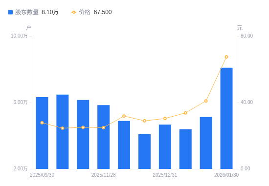 2月2日消息,数据显示,截至2026年1月30日,晓程科技A股股东总户数为8.1万户,较上期(2026年1月20日)增加2.97万户,增幅57.98%。公司最新A股总股本为2.74亿股,其中流通A股2.34亿股,户均持有流通A股数量为2885.93股,较上期减少1673.28股,降幅36.70%;户均持流通A股市值19.48万元,较上期增加8100.77元,增幅4.34%。