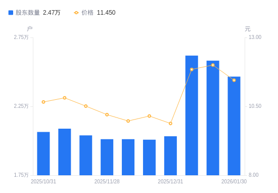 近一年(2025年2月28日至2026年1月30日),盈康生命A股股东户数从1.87万户,增加至2.47万户,增幅32.09%,区间股价上涨9.67%。