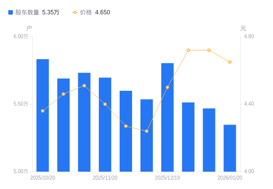 近一年(2025年1月20日至2026年1月20日),南方泵业A股股东户数从4.48万户,增加至5.35万户,增幅19.37%,区间股价上涨27.75%。