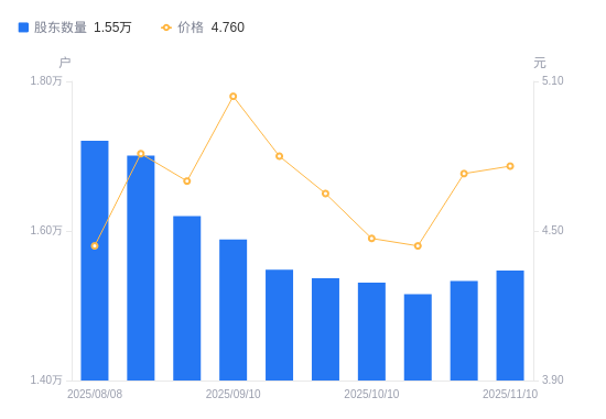 近一年(2024年10月31日至2025年10月31日),ST天瑞A股股东户数从2.98万户,减低至1.53万户,降幅48.55%,区间股价上涨18.25%。
