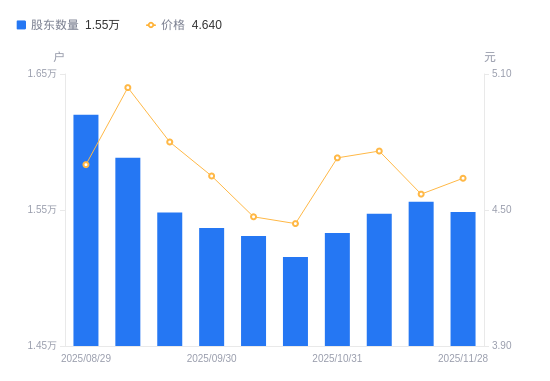 近一年(2024年11月29日至2025年11月28日),ST天瑞A股股东户数从2.8万户,减低至1.55万户,降幅44.63%,区间股价上涨17.77%。