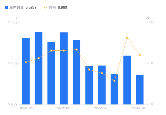 近一年(2025年2月10日至2026年1月30日),万达信息A股股东户数从6.83万户,减低至5.55万户,降幅18.70%,区间股价下跌17.38%。