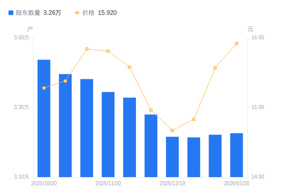 1月21日消息,数据显示,截至2026年1月20日,东软载波A股股东总户数为3.26万户,较上期(2026年1月9日)增加57户,增幅0.18%。公司最新A股总股本为4.63亿股,其中流通A股4.07亿股,户均持有流通A股数量为1.25万股,较上期减少21.87股,降幅0.17%;户均持流通A股市值19.87万元,较上期增加4027.18元,增幅2.07%。