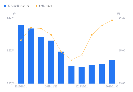 近一年(2025年2月10日至2026年1月30日),东软载波A股股东户数从3.31万户,减低至3.28万户,降幅0.89%,区间股价下跌6.17%。