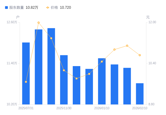 2月12日消息,数据显示,截至2026年2月10日,力源信息A股股东总户数为10.82万户,较上期(2026年1月31日)减少4500户,降幅3.99%。公司最新A股总股本为11.51亿股,其中流通A股10.46亿股,户均持有流通A股数量为9669.2股,较上期增加386.08股,增幅4.16%;户均持流通A股市值10.37万元,较上期增加704.04元,增幅0.68%。