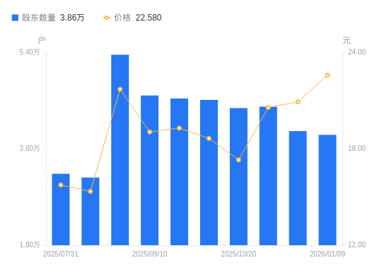 近一年(2025年1月10日至2026年1月9日),科德教育A股股东户数从2.91万户,增加至3.86万户,增幅32.72%,区间股价上涨49.93%。
