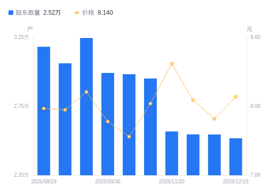 近一年(2024年12月20日至2025年12月19日),长荣股份A股股东户数从2.67万户,减低至2.52万户,降幅5.51%,区间股价上涨29.62%。