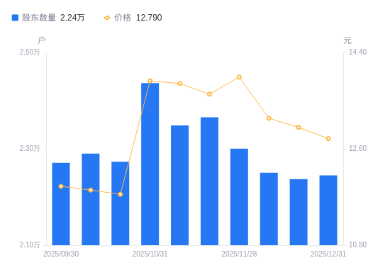 1月8日消息,数据显示,截至2025年12月31日,理邦仪器A股股东总户数为2.24万户,较上期(2025年12月19日)增加76户,增幅0.34%。公司最新A股总股本为5.8亿股,其中流通A股3.38亿股,户均持有流通A股数量为1.51万股,较上期减少51.21股,降幅0.34%;户均持流通A股市值19.28万元,较上期减少3831.23元,降幅1.95%。