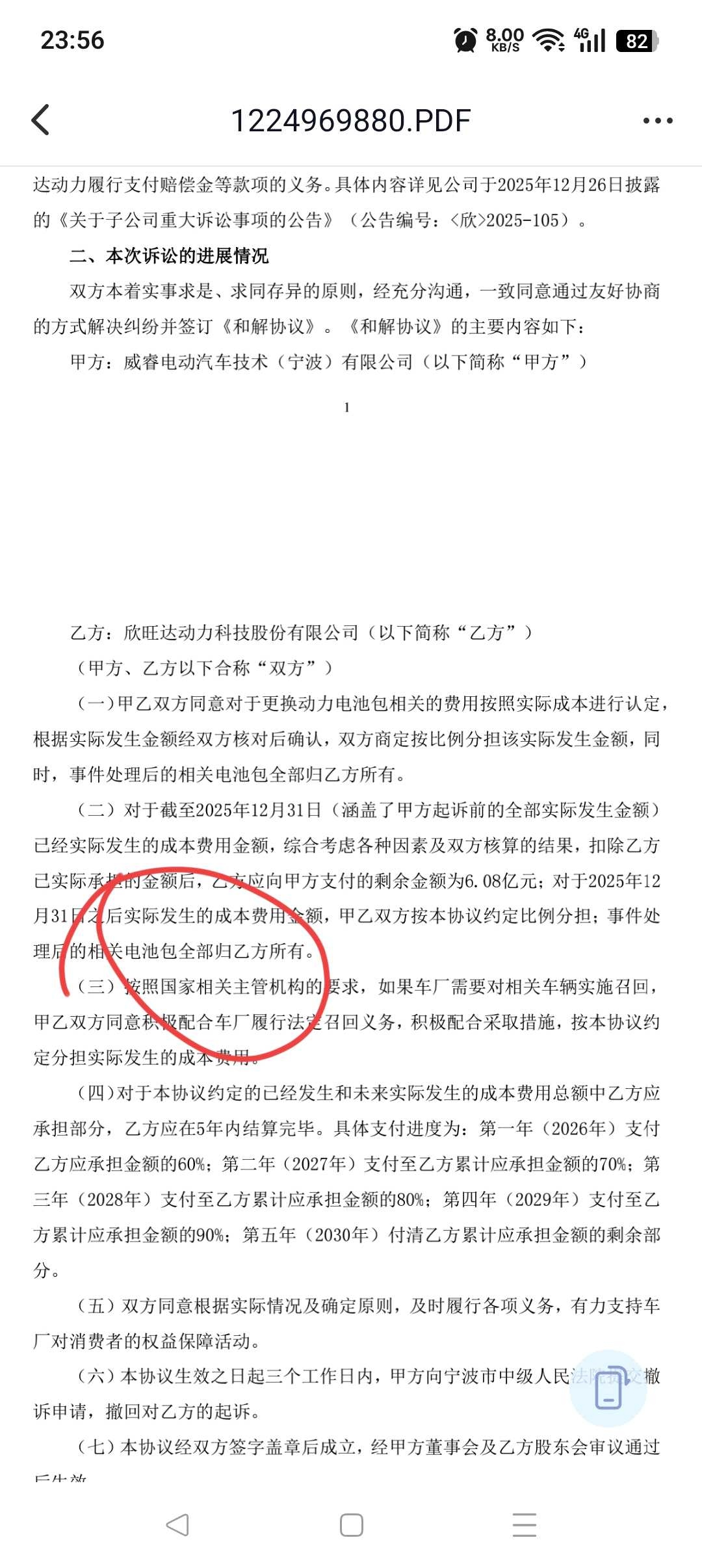 【欣旺达:子公司与威睿电动达成和解 预计影响2025年归母净利润5亿元-8亿元】欣旺达(300207.SZ)公告称,公司子公司欣旺达动力(被告)与威睿电动(原告)在一审阶段达成和解并签订《和解协议》,原告将在《和解协议》生效后撤回起诉。该案原告的起诉金额为23.14亿元。根据《和解协议》约定,双方按...