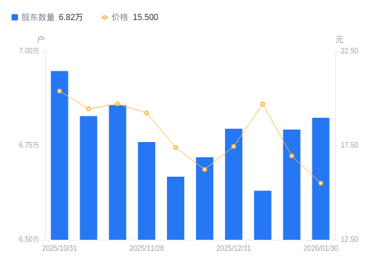 近一年(2025年2月10日至2026年1月30日),易华录A股股东户数从7.28万户,减低至6.82万户,降幅6.26%,区间股价下跌36.16%。