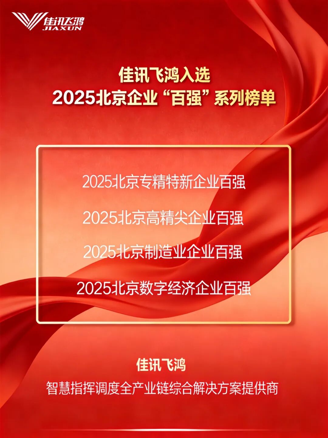 北京佳讯飞鸿(300213)电气股份有限公司(以下简称“佳讯飞鸿”,股票代码:300213)凭借在制造业领域的深厚积淀、高精尖技术的创新突破、专精特新的发展优势及数字经济领域的融合实践成效,成功跻身“2025北京制造业企业百强名单”“2025北京高精尖企业百强名单”“2025北京专精特新企业百强榜单”“2025北京数字经济企业百强”四大权威榜单,全方位彰显了企业在首都经济高质量发展浪潮中的综合核心竞争力。