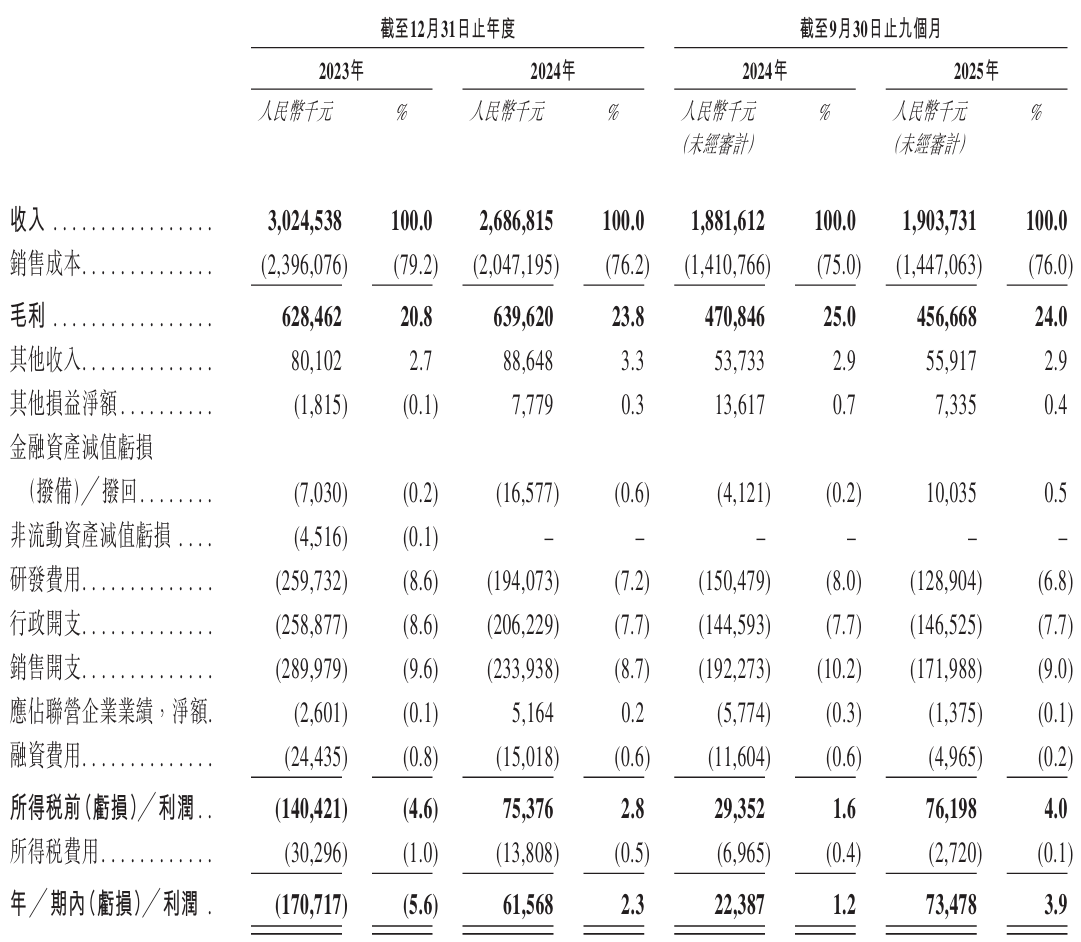 尽管科大智能在申请文件中将该变化归因于对部分亏损业务的剥离,以及2024年国内工业机器人行业整体增速放缓、下游汽车、3C等领域产能优化等因素,但大客户流失后的“失速”才是真相: 随着头部客户集体消失,该板块毛利率如过山车般剧烈抖动,2025年前九个月暴跌13.5个百分点,仅余20.3%。