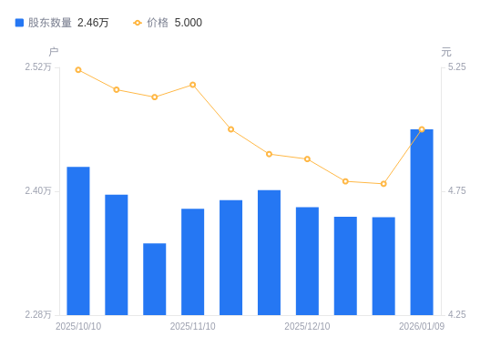 近一年(2025年1月20日至2026年1月9日),永利股份A股股东户数从2.38万户,增加至2.46万户,增幅3.32%,区间股价上涨18.62%。