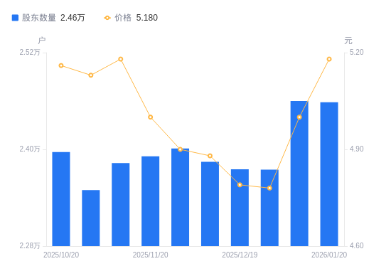 近一年(2025年1月20日至2026年1月20日),永利股份A股股东户数从2.38万户,增加至2.46万户,增幅3.25%,区间股价上涨22.89%。
