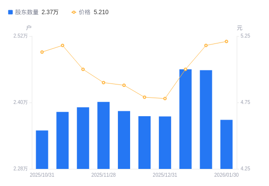 近一年(2025年2月10日至2026年1月30日),永利股份A股股东户数从2.34万户,增加至2.37万户,增幅1.38%,区间股价上涨16.95%。