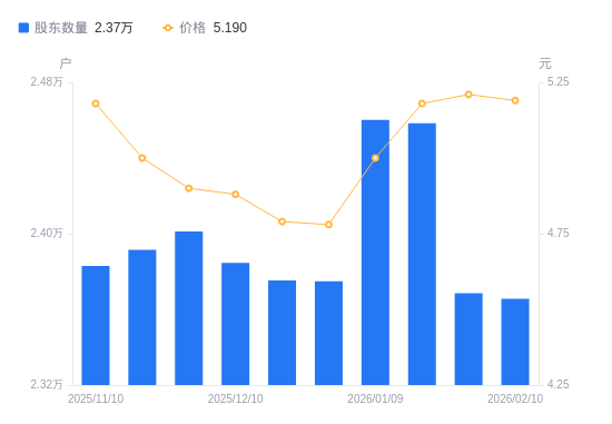 近一年(2025年2月10日至2026年2月10日),永利股份A股股东户数从2.34万户,增加至2.37万户,增幅1.25%,区间股价上涨16.50%。