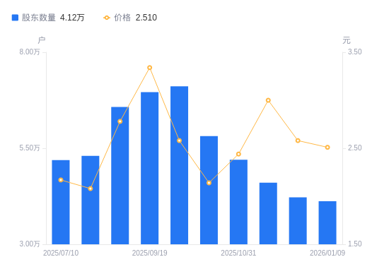 近一年(2025年1月20日至2026年1月9日),ST美晨A股股东户数从4.27万户,减低至4.12万户,降幅3.60%,区间股价上涨18.96%。