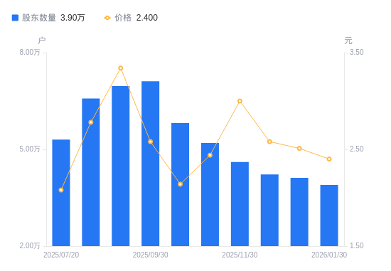 近一年(2025年2月20日至2026年1月30日),ST美晨A股股东户数从4.3万户,减低至3.9万户,降幅9.35%,区间股价上涨12.68%。