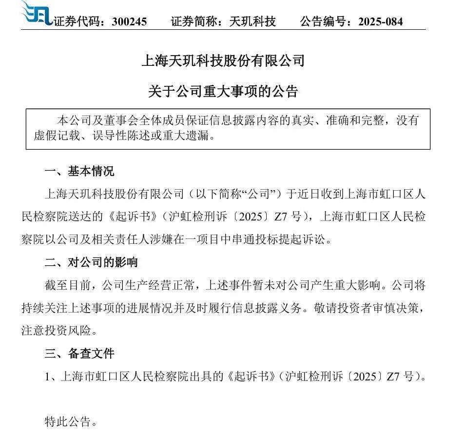 2025年12月22日,天玑科技(300245.SZ)一纸《关于收到起诉书的公告》,将公司拖入新一轮舆论旋涡:上海市虹口区人民检察院以“串通投标罪”对上市公司及三名时任责任人提起公诉。