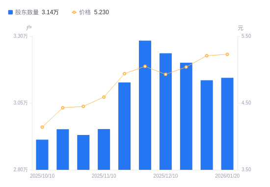 1月21日消息,数据显示,截至2026年1月20日,融捷健康A股股东总户数为3.14万户,较上期(2026年1月10日)增加94户,增幅0.30%。公司最新A股总股本为8.04亿股,其中流通A股8.03亿股,户均持有流通A股数量为2.55万股,较上期减少76.58股,降幅0.30%;户均持流通A股市值13.36万元,较上期增加111.89元,增幅0.08%。