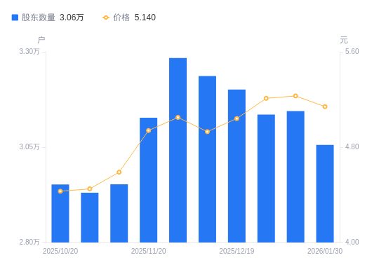 2月12日消息,数据显示,截至2026年1月30日,融捷健康A股股东总户数为3.06万户,较上期(2026年1月20日)减少886户,降幅2.82%。公司最新A股总股本为8.04亿股,其中流通A股8.03亿股,户均持有流通A股数量为2.63万股,较上期增加740.5股,增幅2.90%;户均持流通A股市值13.51万元,较上期增加1507.29元,增幅1.13%。