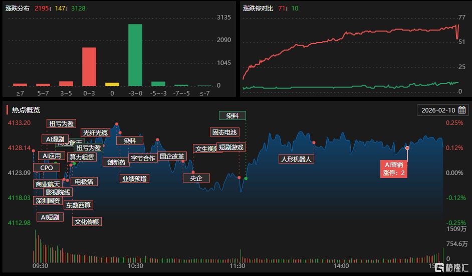 2月10日,三大指数小幅震荡,沪指录得6连阳。全市场成交额2.12万亿元,较前一交易日缩量1454亿元。