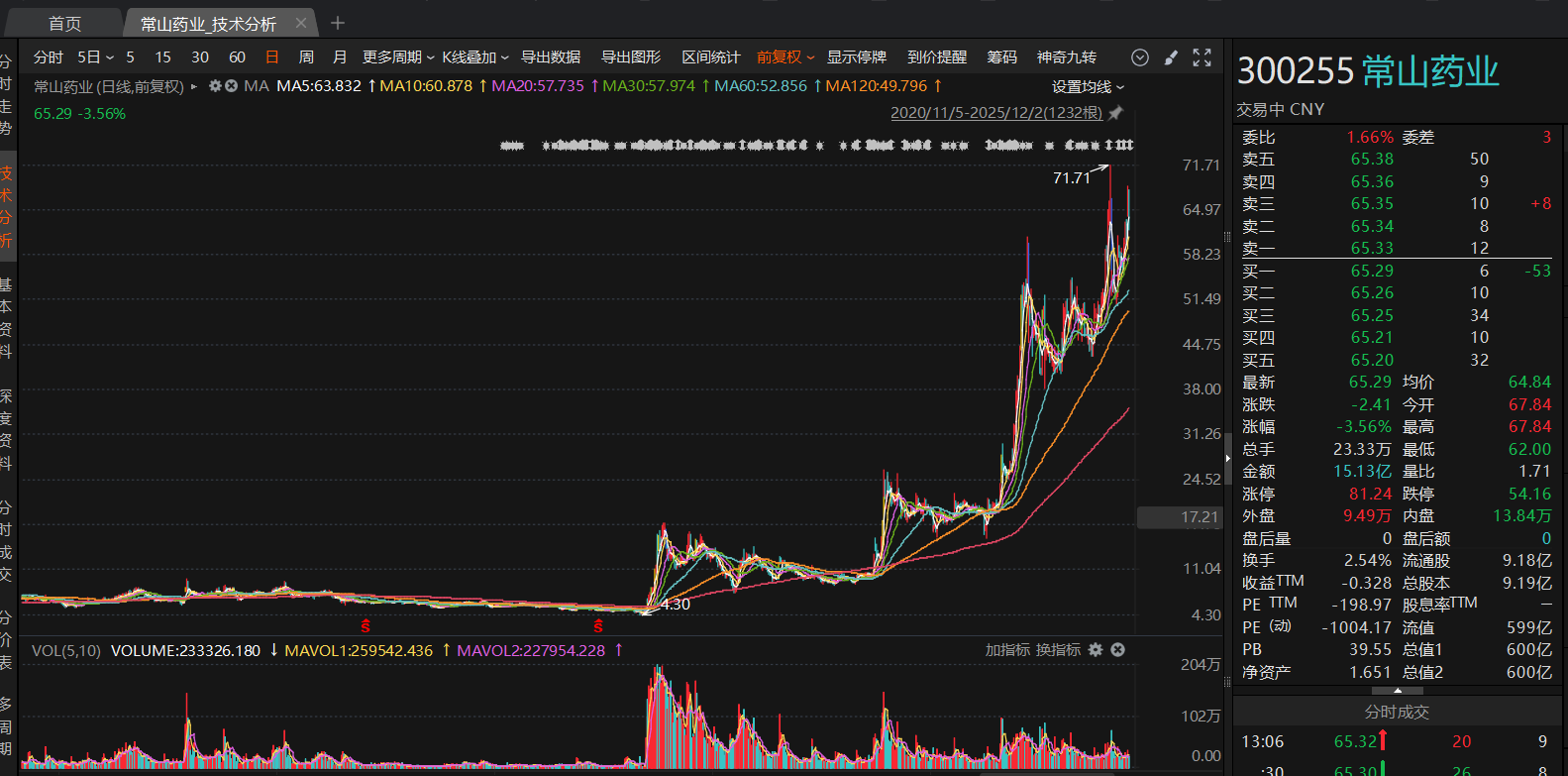 在此背景下,常山药业获资本狂热追捧:2023年9月至2025年11月,股价从4.5元飙升至71元,涨幅超14倍,市值最高达659亿元。