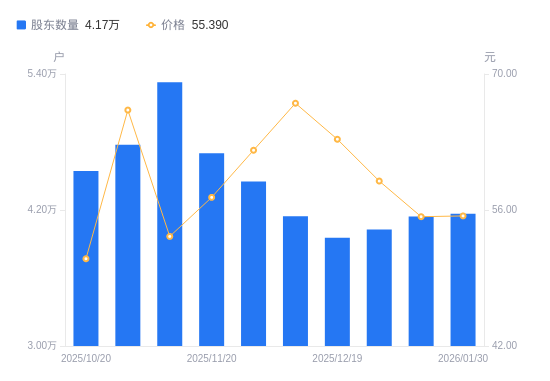 2月2日消息,数据显示,截至2026年1月30日,常山药业A股股东总户数为4.17万户,较上期(2026年1月20日)增加245户,增幅0.59%。公司最新A股总股本为9.19亿股,其中流通A股9.18亿股,户均持有流通A股数量为2.2万股,较上期减少130.19股,降幅0.59%;户均持流通A股市值121.96万元,较上期减少5439.57元,降幅0.44%。
