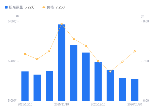 近一年(2025年1月20日至2026年1月20日),雅本化学A股股东户数从6.18万户,减低至5.22万户,降幅15.47%,区间股价上涨9.19%。