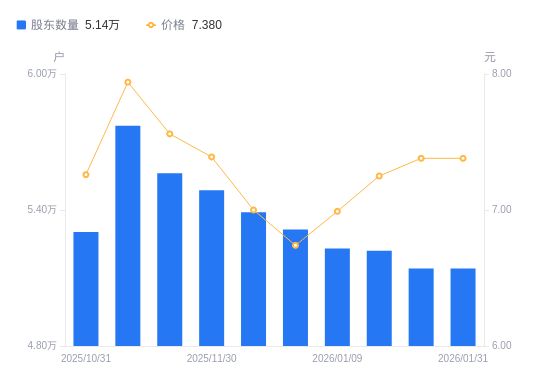 2月4日消息,数据显示,截至2026年1月31日,雅本化学A股股东总户数为5.14万户,较上期(2026年1月30日)不变。公司最新A股总股本为9.63亿股,其中流通A股9.43亿股,户均持有流通A股数量为1.83万股,较上期不变;户均持流通A股市值13.53万元,较上期不变。