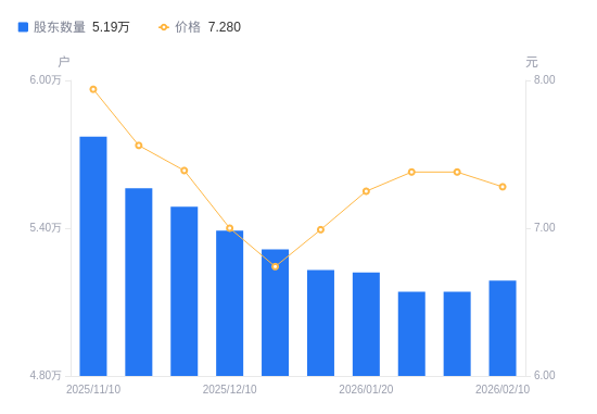 近一年(2025年2月10日至2026年2月10日),雅本化学A股股东户数从6.24万户,减低至5.19万户,降幅16.84%,区间股价上涨7.69%。