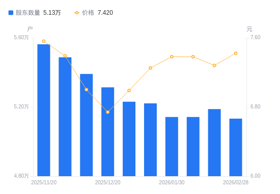3月3日消息,数据显示,截至2026年2月28日,雅本化学A股股东总户数为5.13万户,较上期(2026年2月10日)减少550户,降幅1.06%。公司最新A股总股本为9.63亿股,其中流通A股9.43亿股,户均持有流通A股数量为1.84万股,较上期增加194.76股,增幅1.07%;户均持流通A股市值13.63万元,较上期增加3989.55元,增幅3.02%。