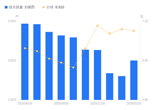 近一年(2025年2月28日至2026年1月20日),佳创视讯A股股东户数从4.51万户,减低至3万户,降幅33.37%,区间股价上涨12.18%。