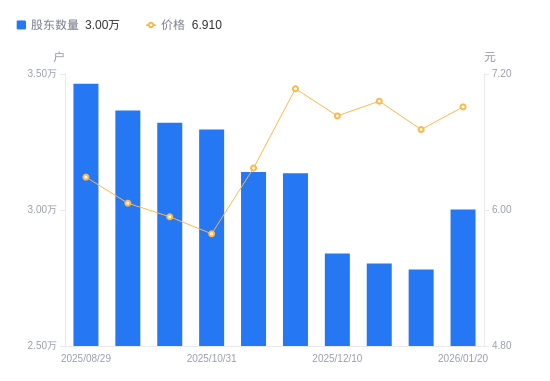 1月27日消息,数据显示,截至2025年12月31日,佳创视讯A股股东总户数为2.78万户,较上期(2025年12月19日)减少218户,降幅0.78%。公司最新A股总股本为4.31亿股,其中流通A股3.7亿股,户均持有流通A股数量为1.33万股,较上期增加103.57股,增幅0.78%;户均持流通A股市值8.94万元,较上期减少2608.66元,降幅2.84%。
