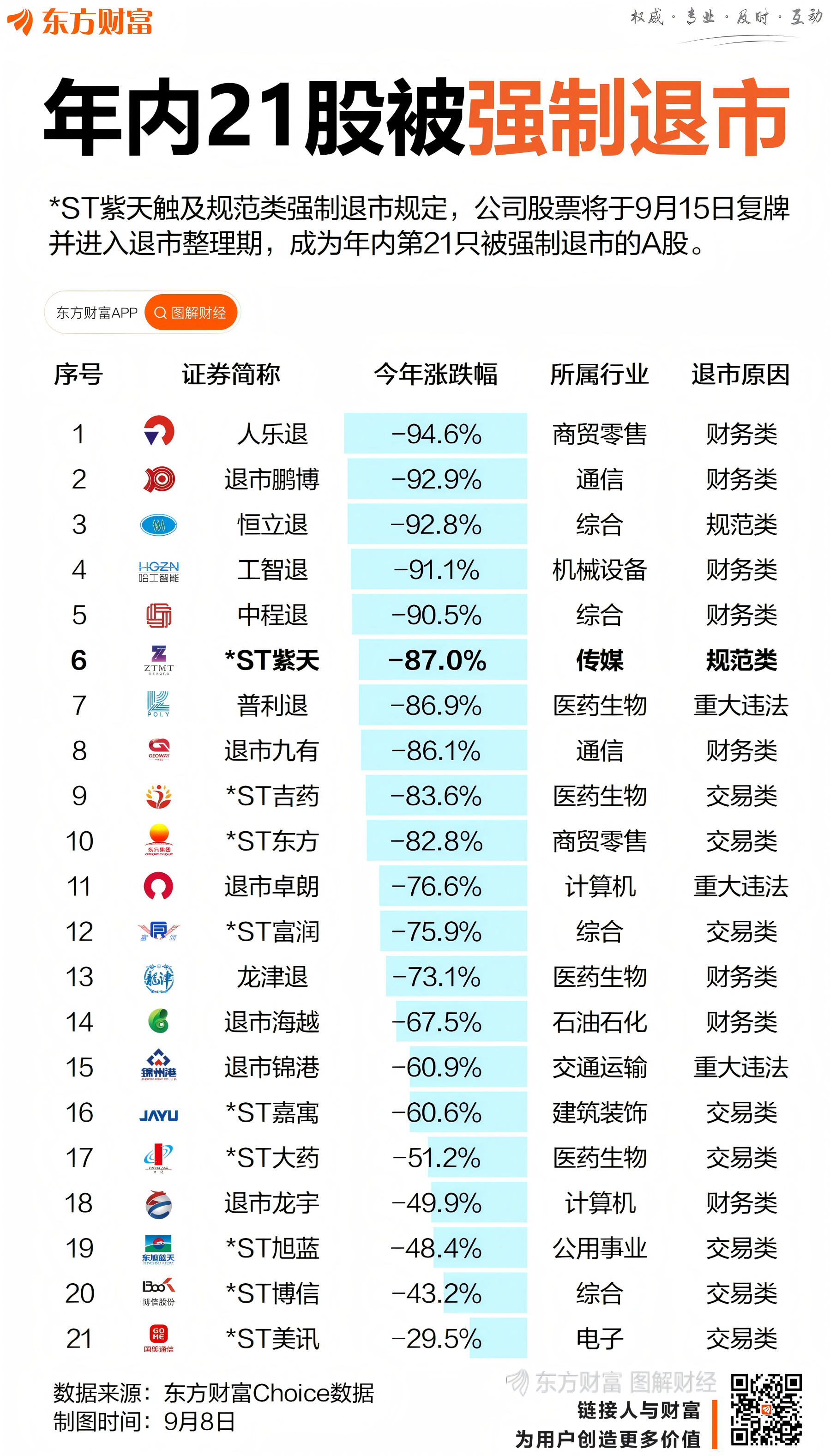 东方财富Chocie数据显示,截至9月7日,今年A股已有25家上市公司退市,其中包括*ST紫天在内的21家因触及重大违法、财务类、规范类、交易类强制退市规定被强制退市,2家被吸收合并,2家主动申请退市。