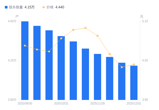 1月5日消息,数据显示,截至2025年12月31日,ST任子行A股股东总户数为4.15万户,较上期(2025年12月19日)减少303户,降幅0.73%。公司最新A股总股本为6.74亿股,其中流通A股5.37亿股,户均持有流通A股数量为1.3万股,较上期增加93.94股,增幅0.73%;户均持流通A股市值5.75万元,较上期增加931.53元,增幅1.65%。
