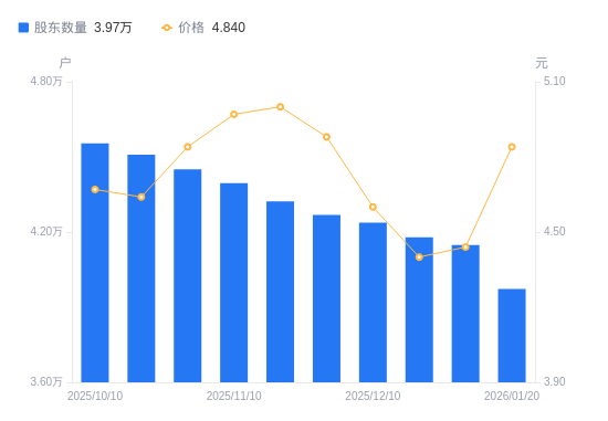 1月22日消息,数据显示,截至2026年1月20日,ST任子行A股股东总户数为3.97万户,较上期(2025年12月31日)减少1756户,降幅4.23%。公司最新A股总股本为6.74亿股,其中流通A股5.37亿股,户均持有流通A股数量为1.35万股,较上期增加572.63股,增幅4.42%;户均持流通A股市值6.55万元,较上期增加7953.5元,增幅13.83%。