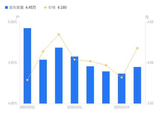 近一年(2025年3月31日至2026年1月20日),珈伟新能A股股东户数从4.93万户,减低至4.45万户,降幅9.68%,区间股价上涨13.59%。
