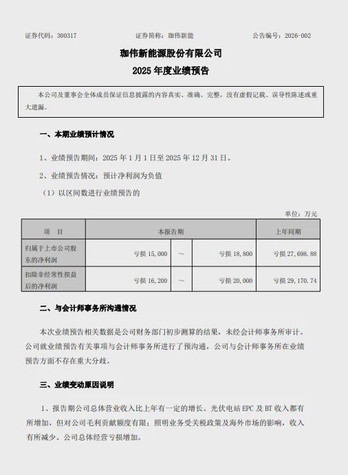 1月29日,珈伟新能(300317)发布2025年度业绩预告。预计2025年归属于上市公司股东的净利润亏损15,000~亏损18,800万元,上年同期亏损27,698.88万元;预计2025年扣除非经常性损益后的净利润亏损16,200~亏损20,000万元,上年同期亏损29,170.74万元。