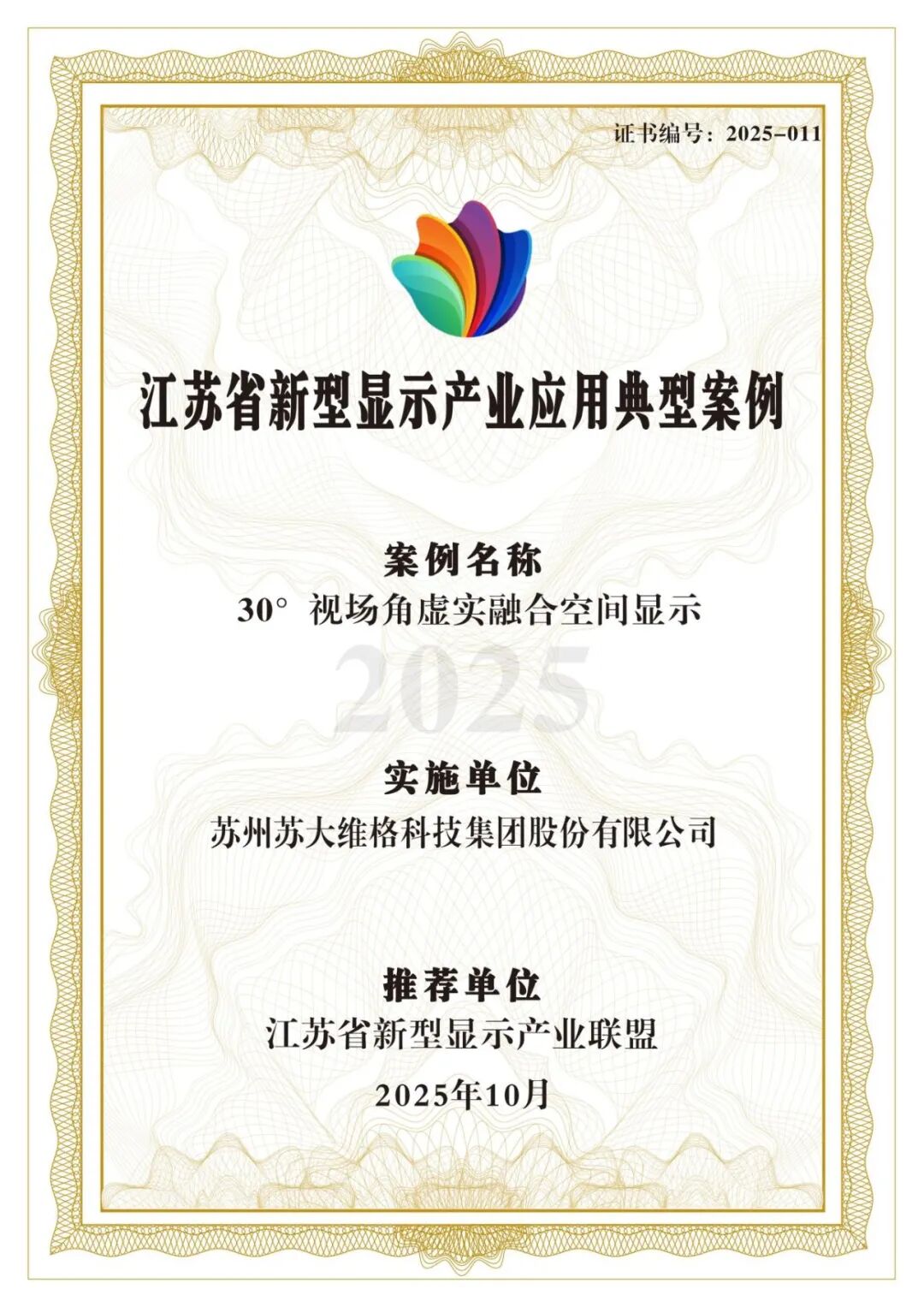 苏大维格(300331)自主研发生产的30°视场角虚实融合空间显示,凭借在文化旅游产业的创新应用,入选“2025年度江苏省新型显示产业应用典型案例”。