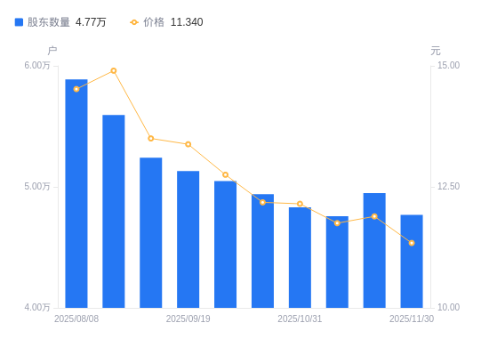 近一年(2024年11月30日至2025年11月30日),兆日科技A股股东户数从5.31万户,减低至4.77万户,降幅10.17%,区间股价下跌19.23%。