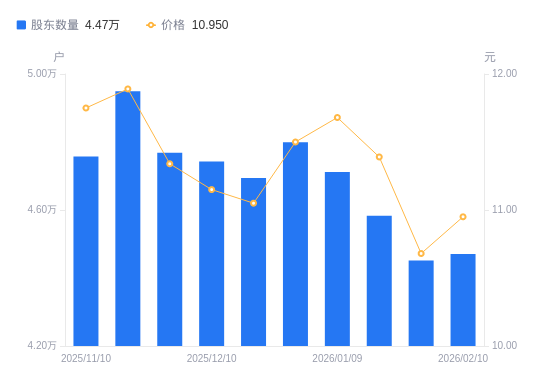 近一年(2025年2月10日至2026年2月10日),兆日科技A股股东户数从6.21万户,减低至4.47万户,降幅28.06%,区间股价下跌29.03%。