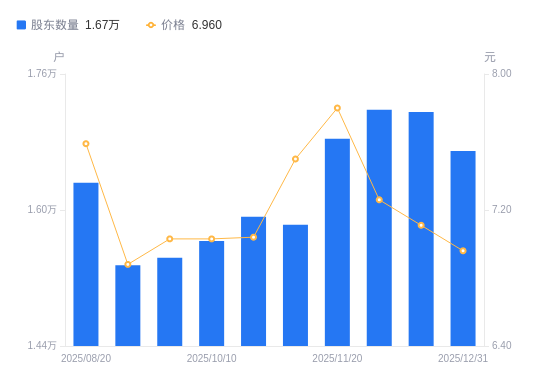 近一年(2024年12月31日至2025年12月31日),津膜科技A股股东户数从1.78万户,减低至1.67万户,降幅6.25%,区间股价上涨18.17%。
