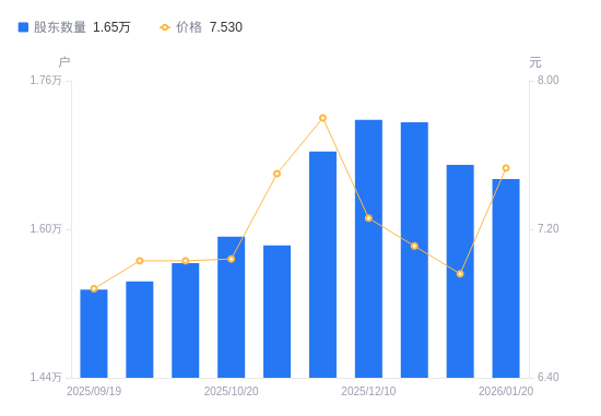 近一年(2025年1月27日至2026年1月20日),津膜科技A股股东户数从1.81万户,减低至1.65万户,降幅8.79%,区间股价上涨34.70%。