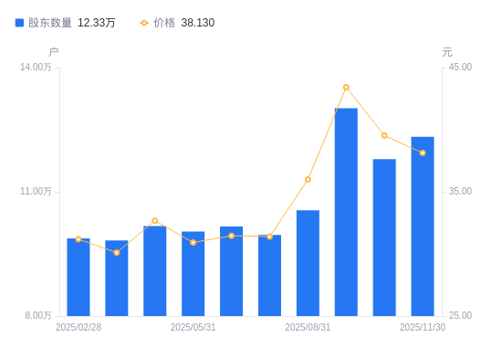 12月5日消息,数据显示,截至2025年11月30日,南大光电A股股东总户数为12.33万户,较上期(2025年10月31日)增加5380户,增幅4.56%。公司最新A股总股本为6.91亿股,其中流通A股6.56亿股,户均持有流通A股数量为5321.79股,较上期减少242.87股,降幅4.36%;户均持流通A股市值20.29万元,较上期减少1.71万元,降幅7.75%。